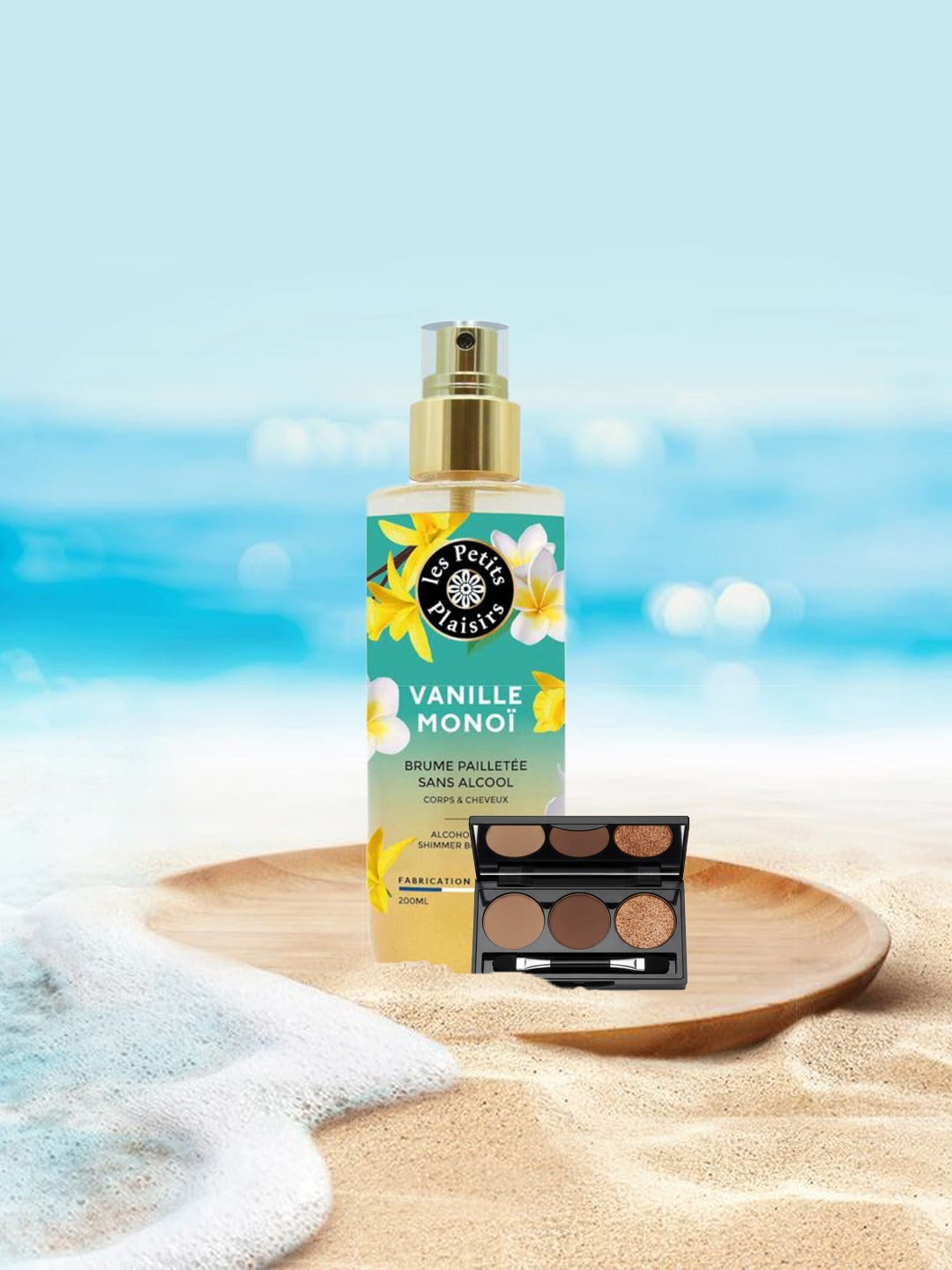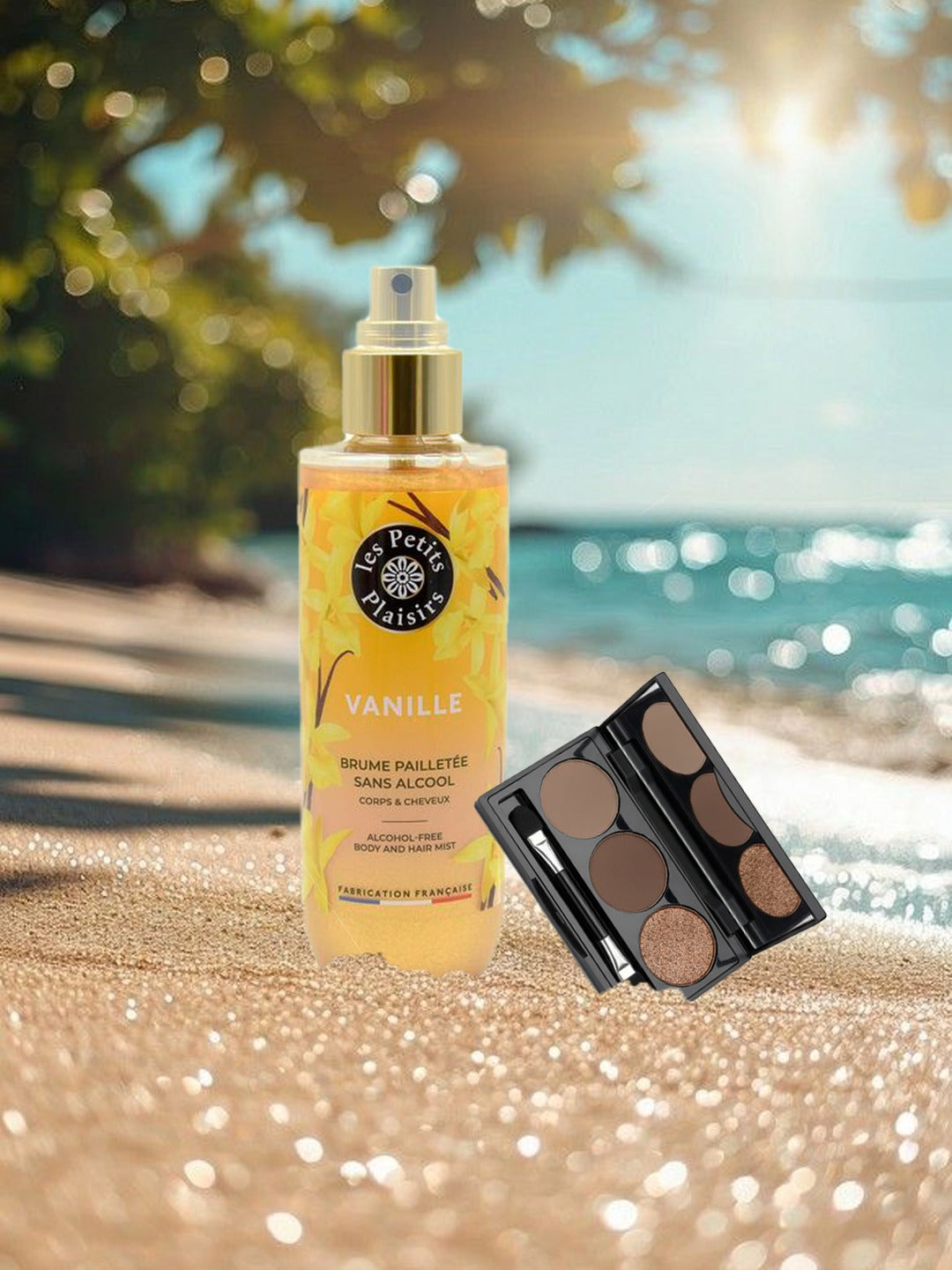 Quand le soleil embrasse l'horizon, le Crépuscule Tiaré révèle sa magie… Trois nuances chaudes, Taupe, Bronze, Ou sculptent un regard mystique en un clin d'œil, tandis que la brume parfumée pailletée dépose un voile scintillant sur la peau et les cheveux.